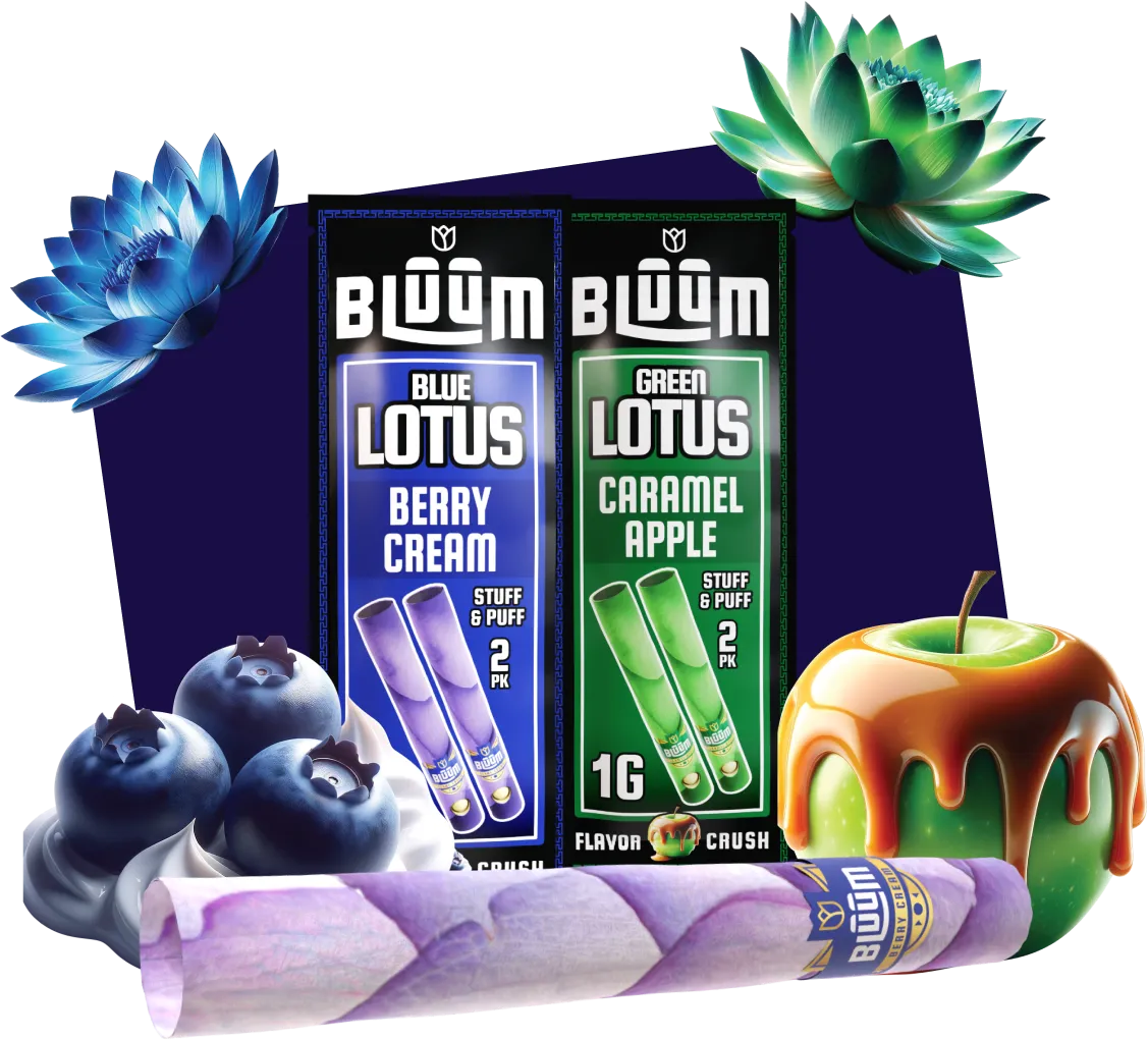 Discover our lotus flower rolls in two delightful flavors. The Green Lotus Roll offers a caramel apple taste, while the Blue Lotus Roll provides a berry cream sensation. With our “Crush for Flavor” technology, enjoy an intense burst of flavor whenever you desire. Indulge in the luxury of nature’s finest.